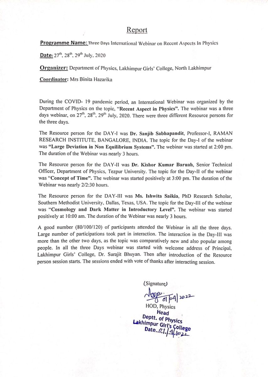 | 2020 | Large Deviations in Non Equilibrium Systems; Concept of Time; Cosmology and Dark Matter in Introductory Level | 120 | 27-07-2020 to 29-07-2020 | ||